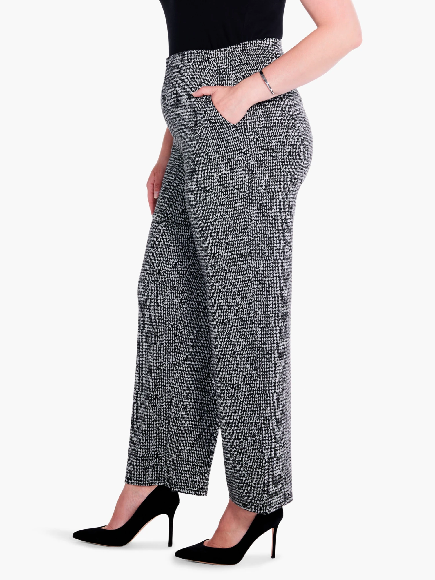 Who would’ve thought that tweed would ever be a trend? Well, it’s here now and we’re all for it. These elevated work/whenever pants come in a wide leg silhouette, breathable ankle length, and feature pull-on ease plus pockets. The pattern is a deliciously fun houndstooth jacquard knit. Pair it with the matching fashion jacket to create a professorial yet poppy look or style the separates your way.
