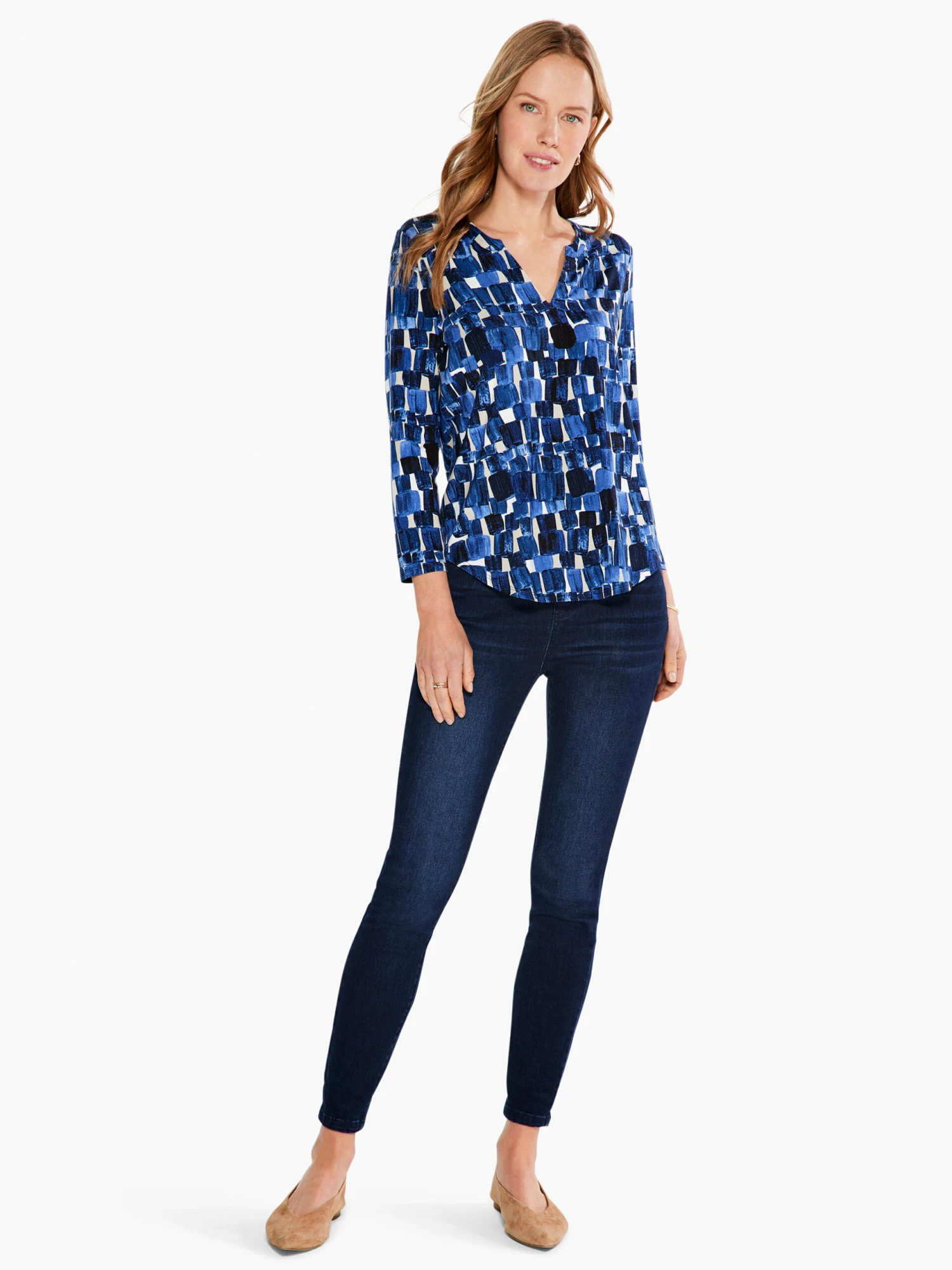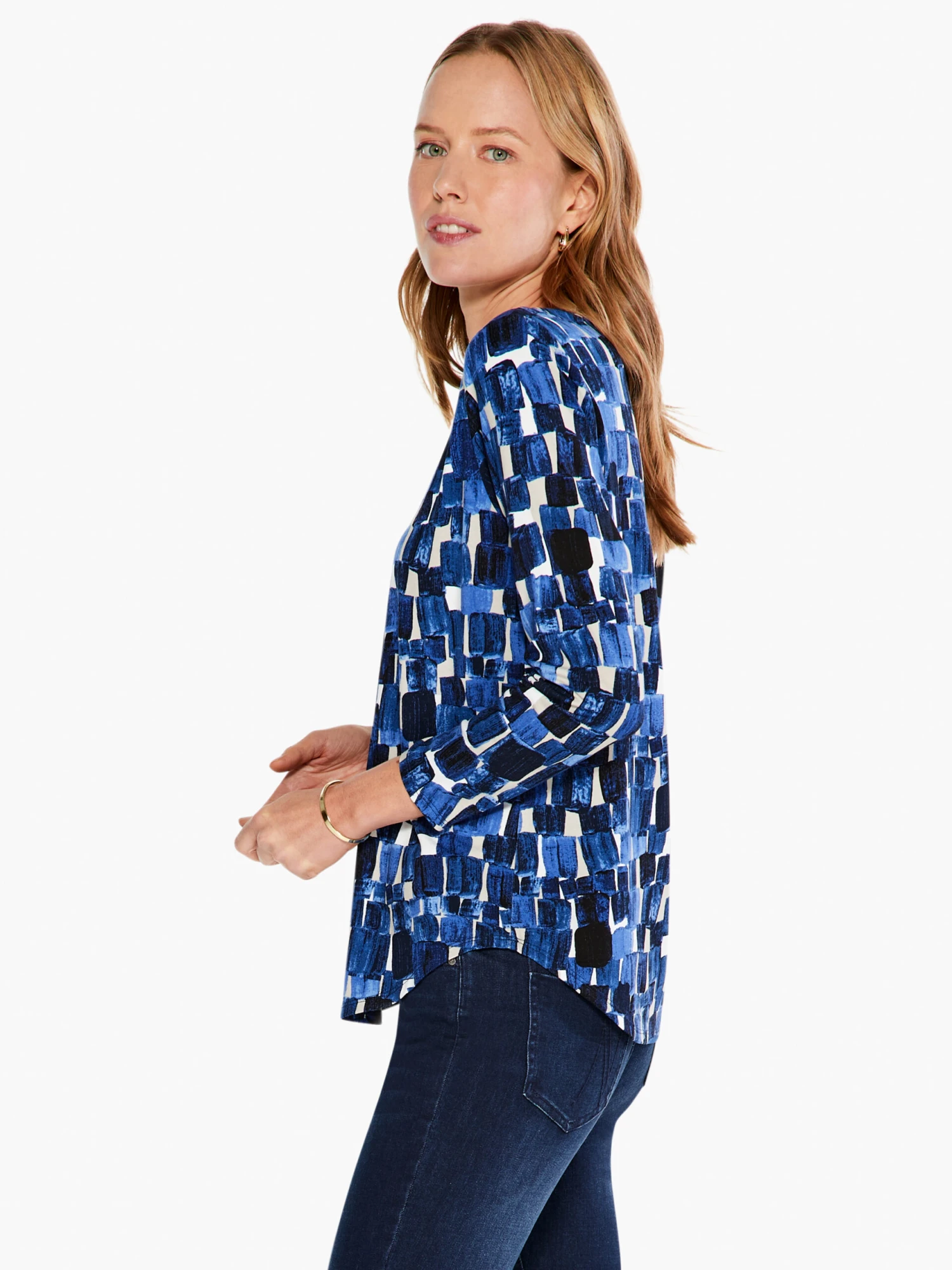 A print that looks like it’s fresh from the artist’s brush. The blocks of dynamic, dark and light blues are complemented by this piece’s easy V-neck shape and soft, stretchy feel. Pullover and with a midweight, non-transparent feel, with a split neck detail and 3/4 sleeves. The hem is designed to sit at the hip.
