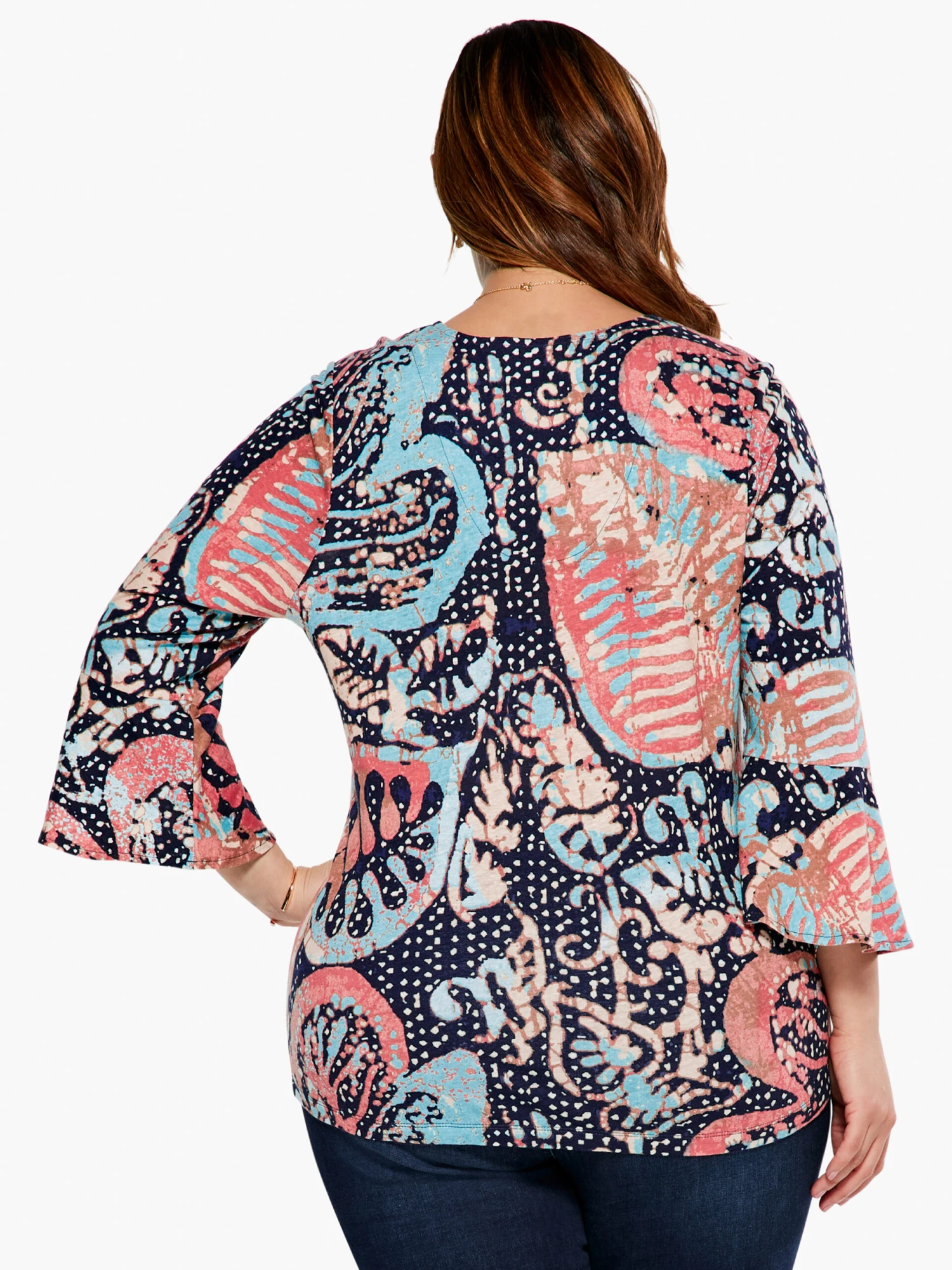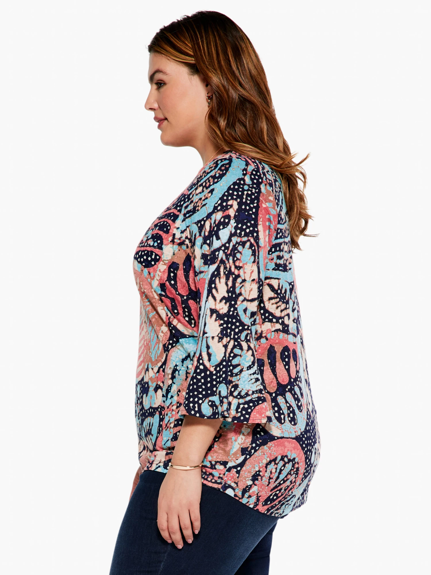 A bold emotional print that’s ready to take center stage of your next outfit. Made from a lightweight and breathable linen with all the benefits of linen-blend with none of the scratchiness. A generous V-neck, 3/4 bell sleeves and a hem that comes down slightly below the hip combine to complete the style.