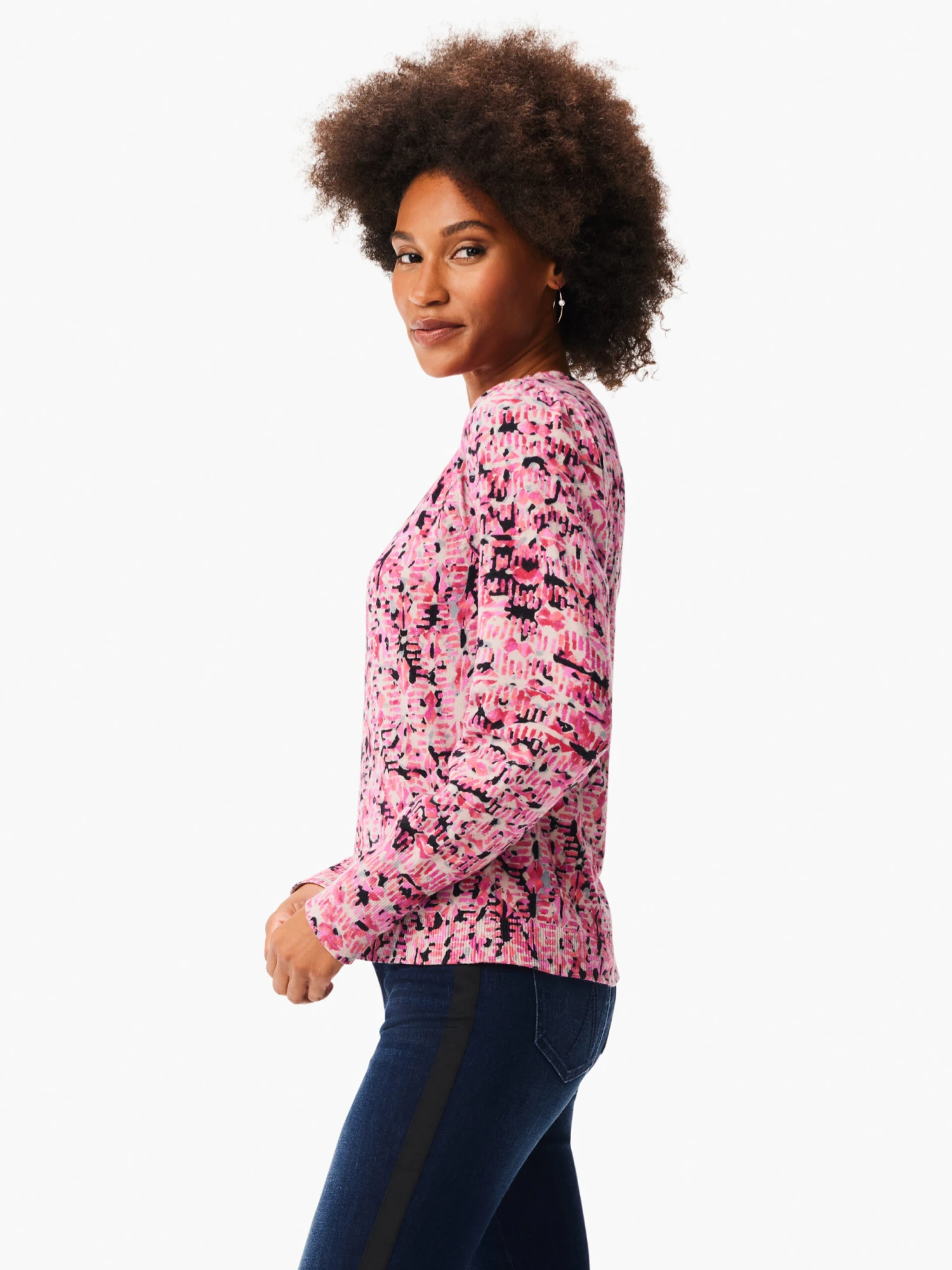 A bright burst of layered color, plus the ease of an everyday pullover, the Blurred Geo Print is a mainstay for every day. The shape features a slight mock neck, longer cuffs, plus a gathering detail at the top of the sleeve to add even more fun femininity. Mindfully Made from “no waste” knitwear.