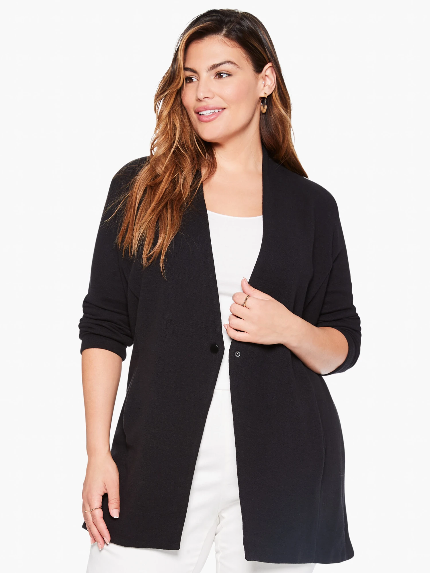 Think of this as if your favorite (super-soft) sweatshirt decided to join forces with your most sophisticated and sleek blazer. She’s ready for anything and everything — chilly mornings, overzealous AC, video-conference calls, trips to the grocery store…and everything in between. The secret is the stretch cotton — it’s soft and easy, meaning you can tackle everything on your daily to-do without feeling confined. Even better? We’ve given this a sleek, slimming waist cinching front closure — so you’ll always look your best.