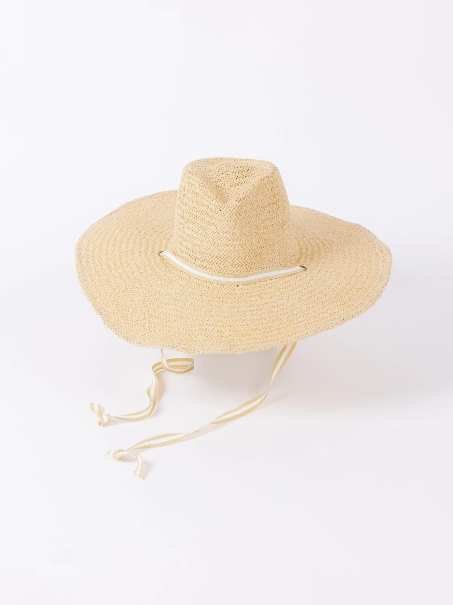 The Elle Chinstrap Hat is a timeless hat made from lightweight paper. It has a contrasting tan and ivory stripe ribbon detail that makes taking your hat on and off extra convenient! This hat is perfect for spending the day gardening, at the beach or running errands! Tie the ribbon to keep the hat secure on more windy days.