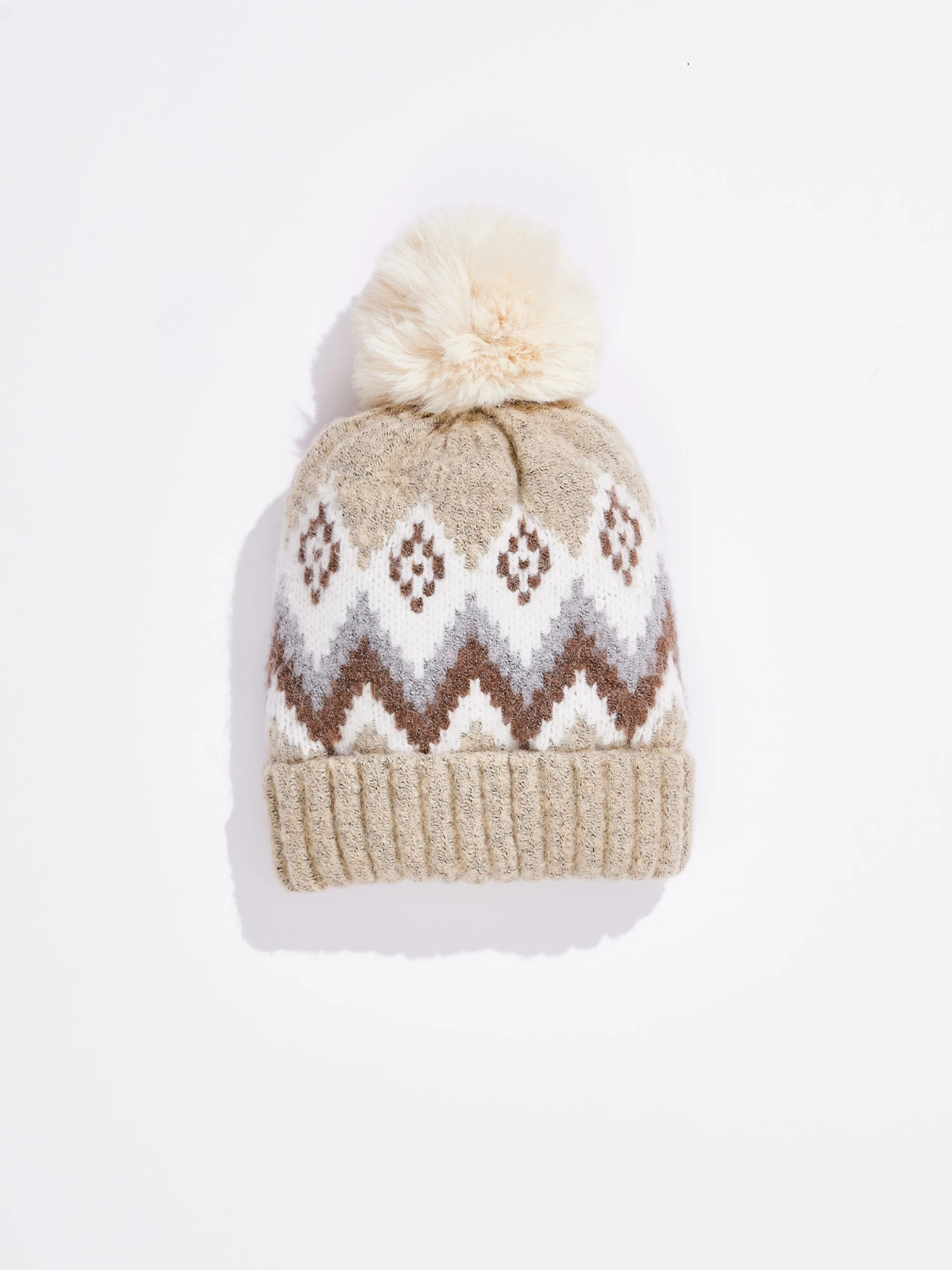 Our classic beanie with a fair isle design features cozy lining and faux fur pom detail.