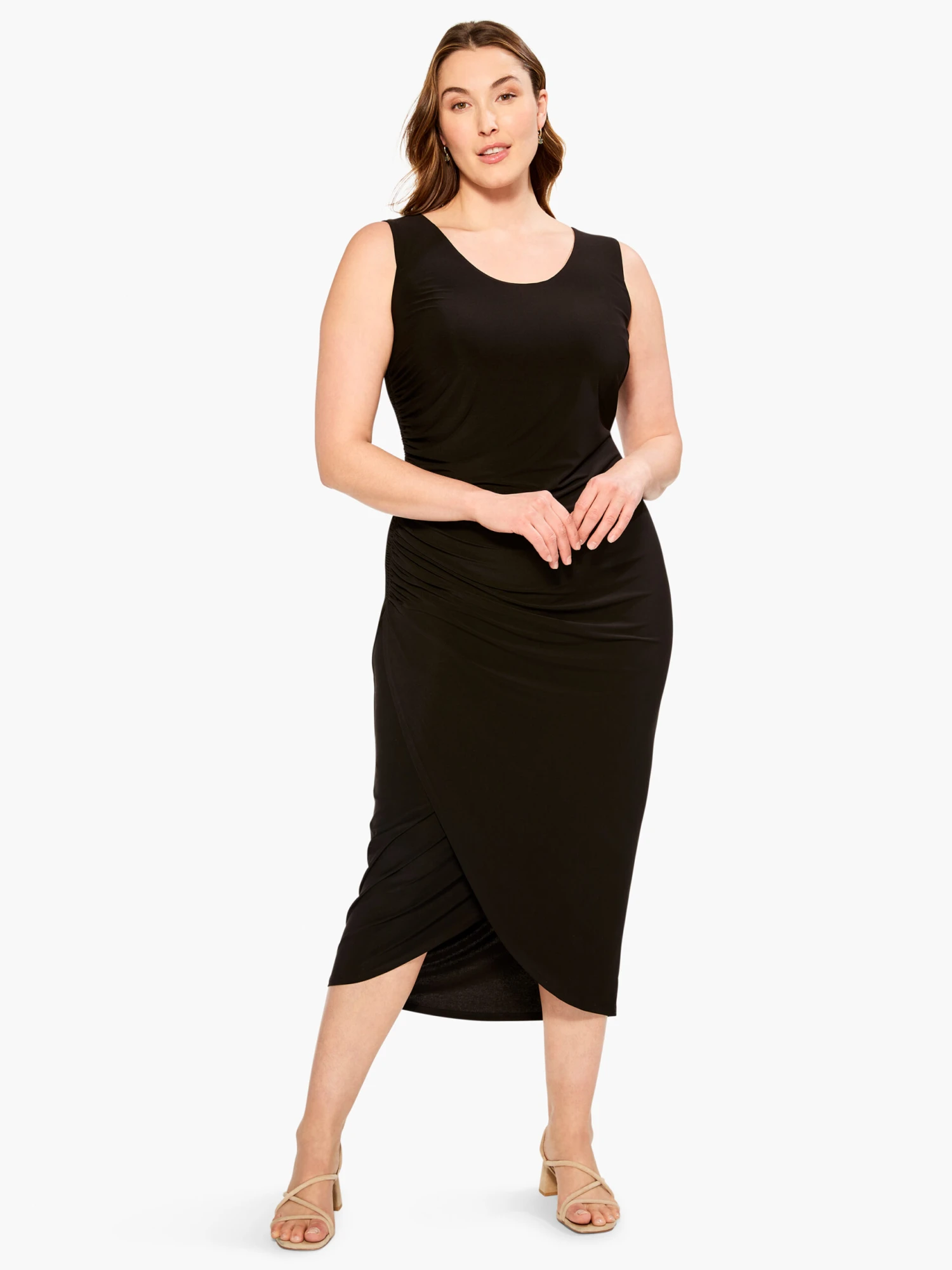 A dressier look that’s as comfortable as anything in your closet thanks to the perfect amount of added stretch. This texture wrap effect, and high twist breaks up the monotone and sets this black dress apart from the crowd. Made with a sleeveless pullover silhouette that falls below the knee
