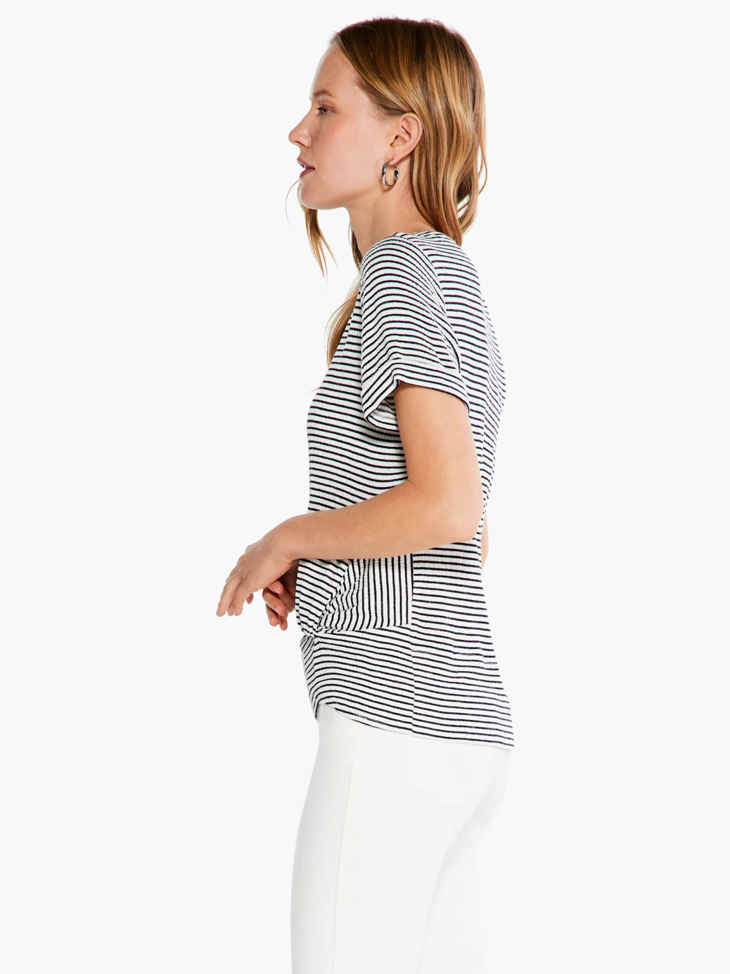A tee shirt with all the design details of your most elevated pieces. In addition to the stripes you can see, there’s a slight puckered texture that adds character you can feel. More than just a pattern, we love this one’s rollover sleeve details and the ruching at the hip that adds more interest. Short-sleeved with a wide bateau neck.