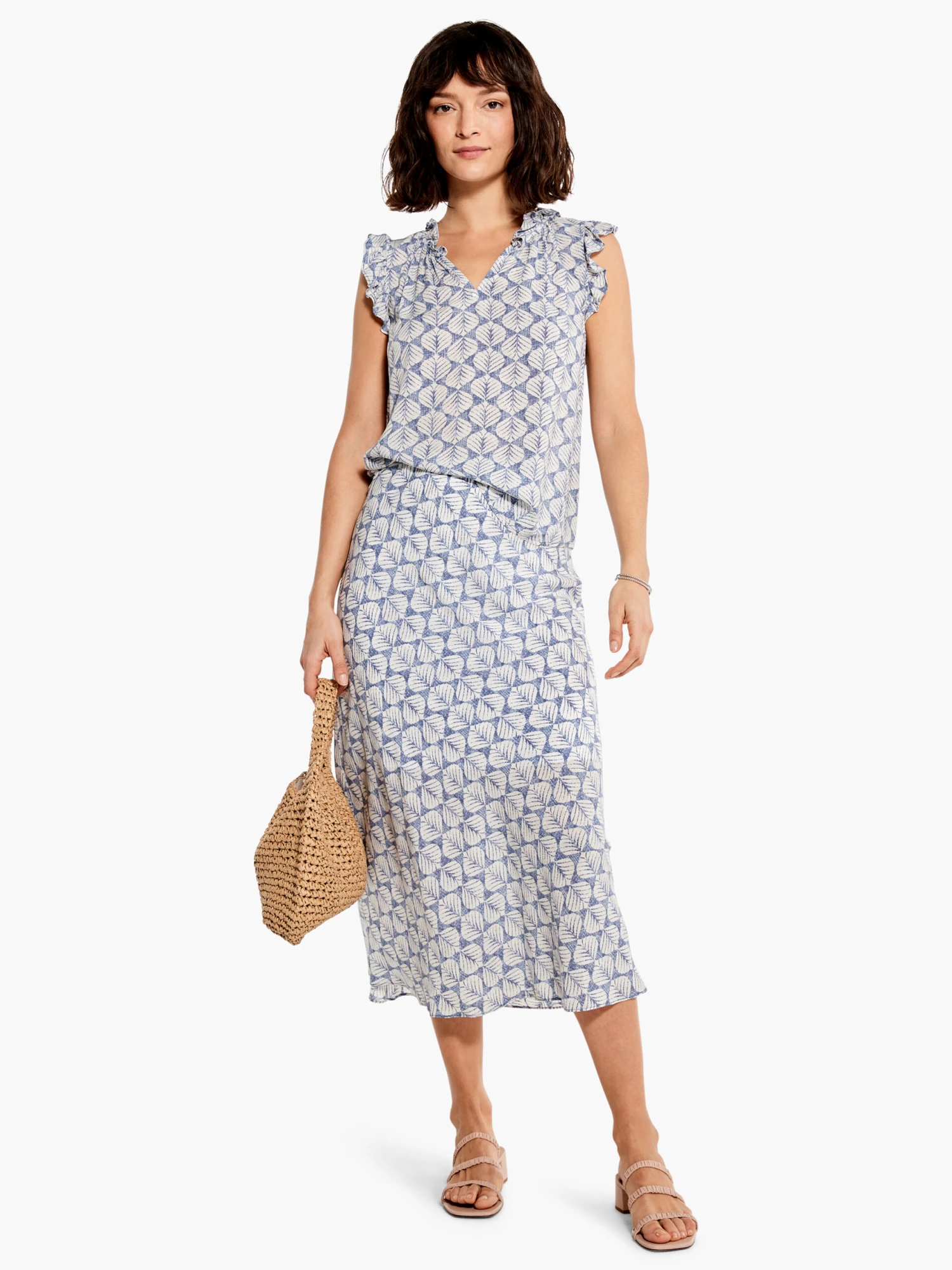 It’s the vintage-yet-modern, organic-yet-geometric print that catches your eye, but don’t sleep on this piece’s delicious details like the feminine ruffle at the sleeve and neck. Dress it up by pairing it with the matching skirt or keep things casual and couple it with your favorite jeans. We gave it a gentle V-neck that complements the pattern and a hem designed to sit at the hip.