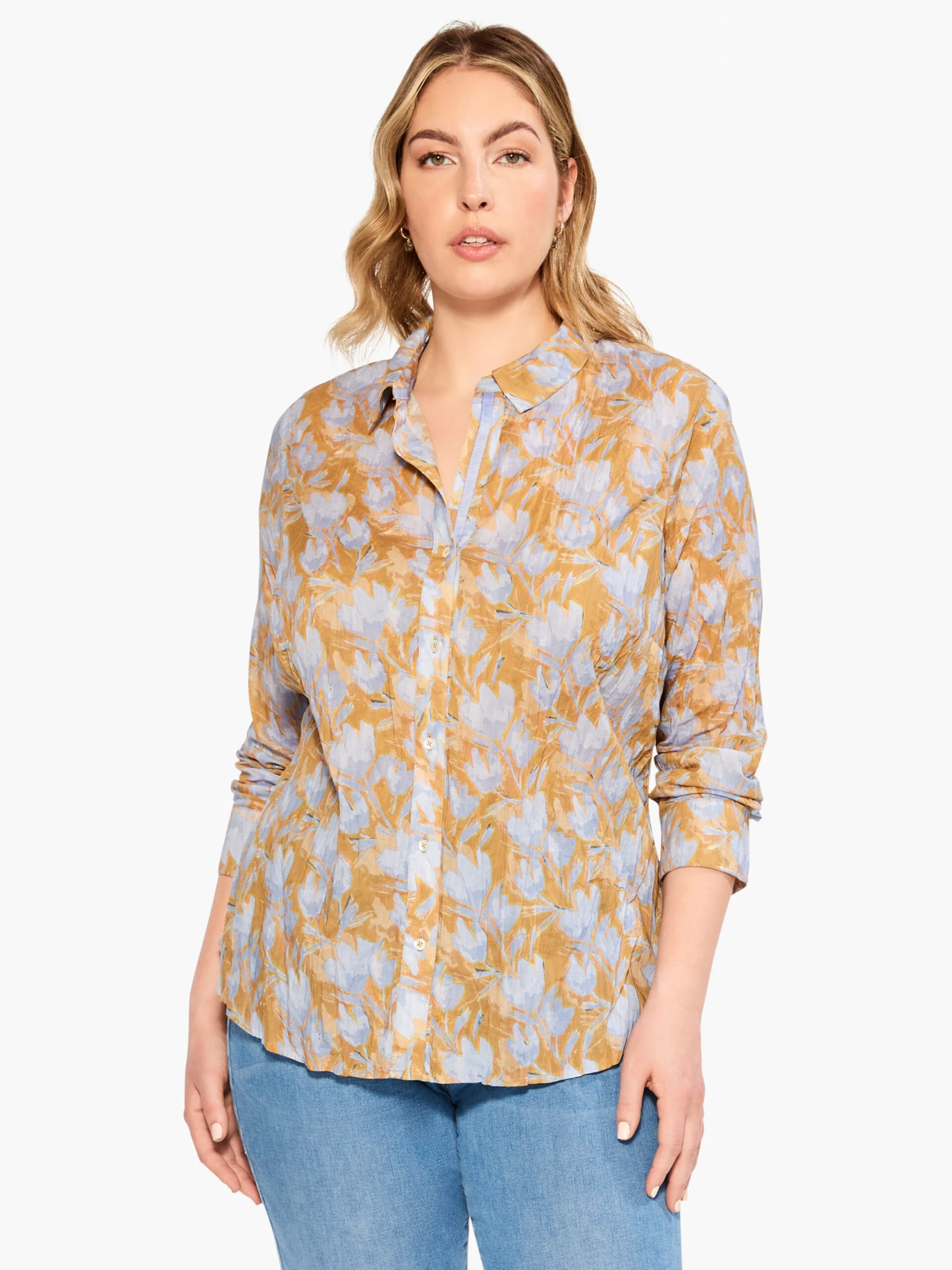A versatile button-down silhouette featuring a print in our elegant, and instantly essential, new neutral and a splash of sophisticated blue. Made from our fan-favorite, incredibly comfortable, Crinkle fabric, this breezy button-down is perfect for denim pairings, linen, or dressier pants. With shirt sleeves, cuffs, a more fitted silhouette, and a hem that falls slightly below the hip.