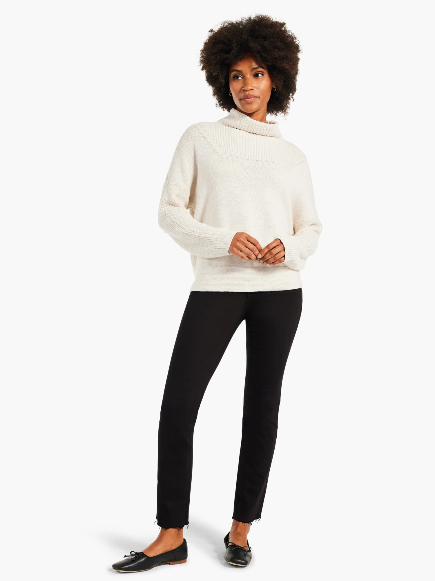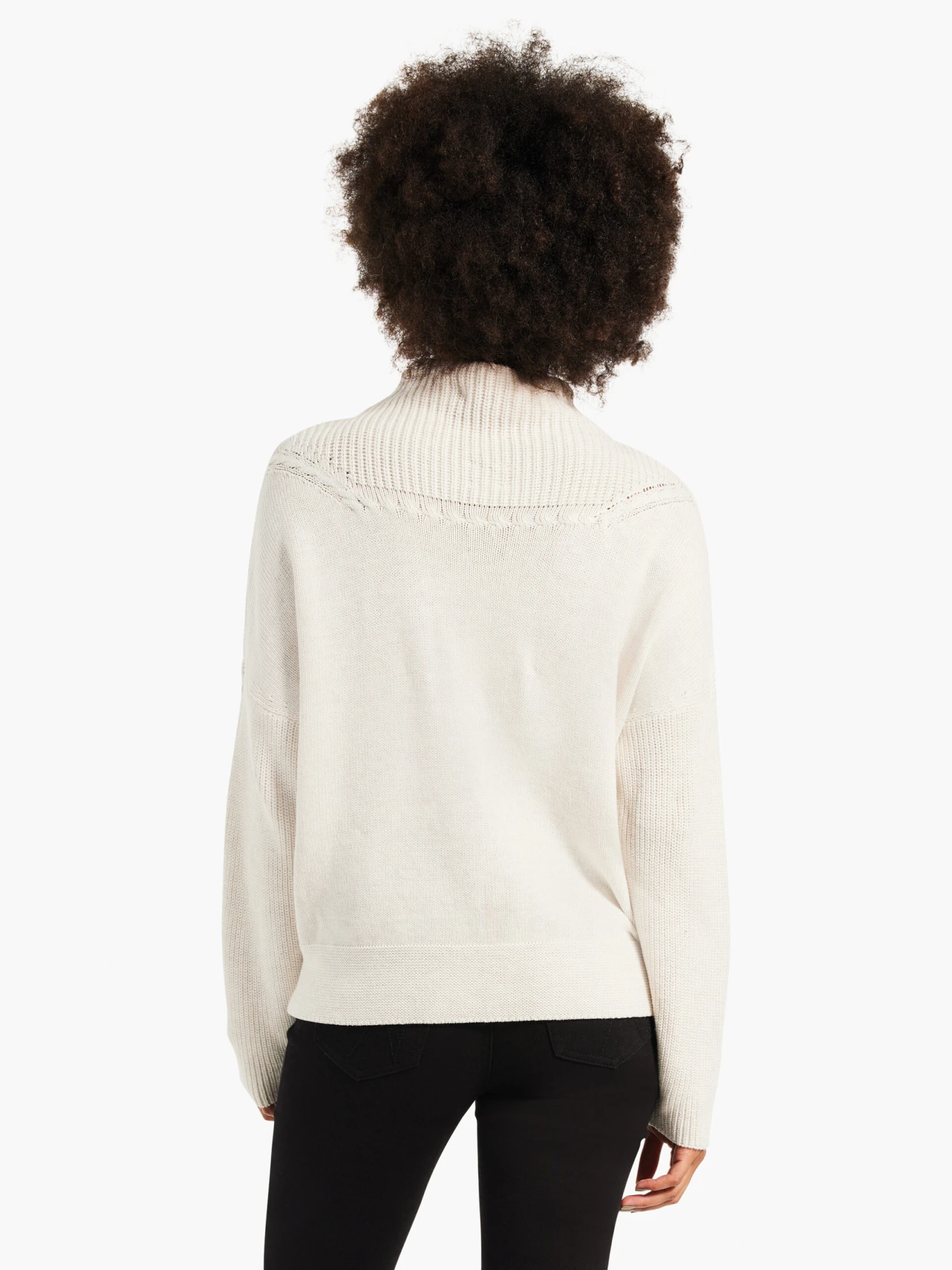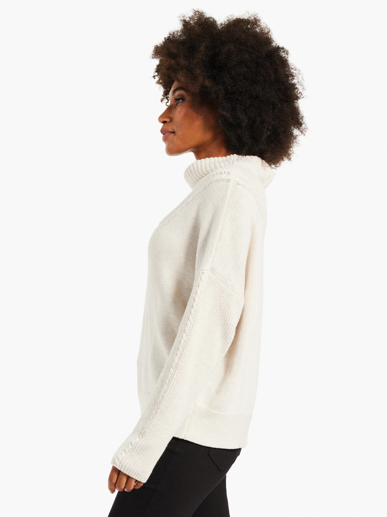 Featuring solid cable knit construction around the neckline and along the funnel neck, but with a drapey flowy fit down the hem, this gorgeous mix of knit techniques is the best of both worlds. Pullover with an easy dropped shoulder silhouette and a hem that sits at the hip. Mindfully Made from “no waste” knitwear.