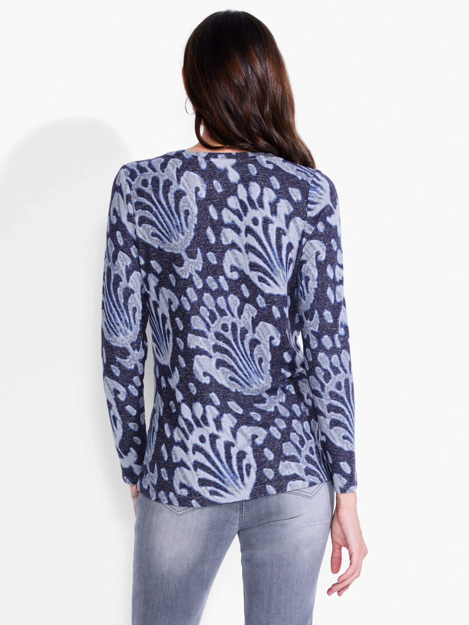 The fabric may be Sweet Dreams (a NIC+ZOE fave for its buttery soft feel) but the abstract floral design in striking grey and black will make you sit up and pay attention. The shape is classic long-sleeved tee but with a gentle V-neck. Light and layerable with a standard tee length that falls to the hip.