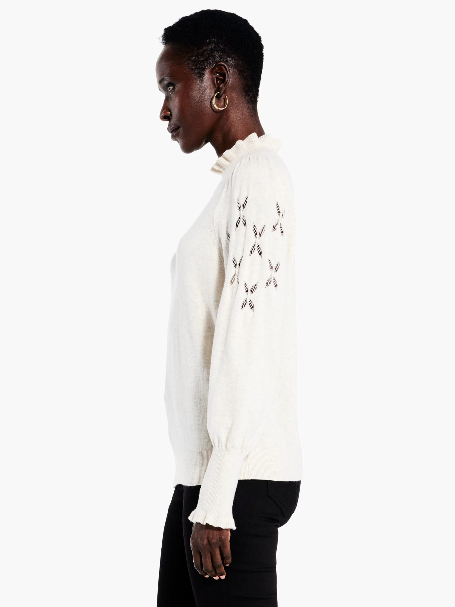- Pointelle cut-out detail, ruffle on cuff and collar