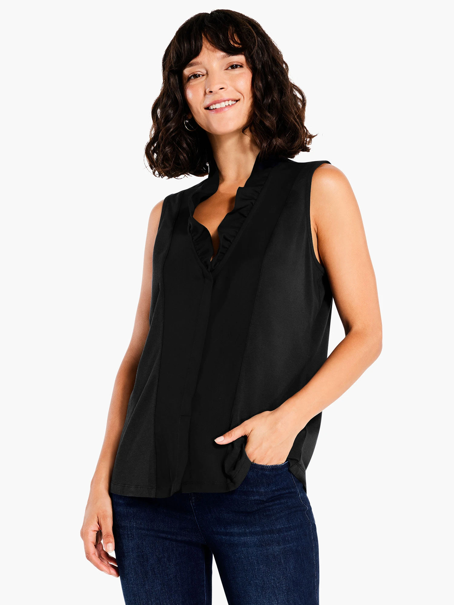 Bring a little extra elegance to your look with the Ruffled Around Tank. The namesake ruffle collar detail is designed to lay flat so you’ll have no problems layering it with a blazer or jacket. Made from a midweight cotton modal that feels breezy and broken in as your favorite tee. With additional woven detail on the front panel. Designed to sit at the hip.