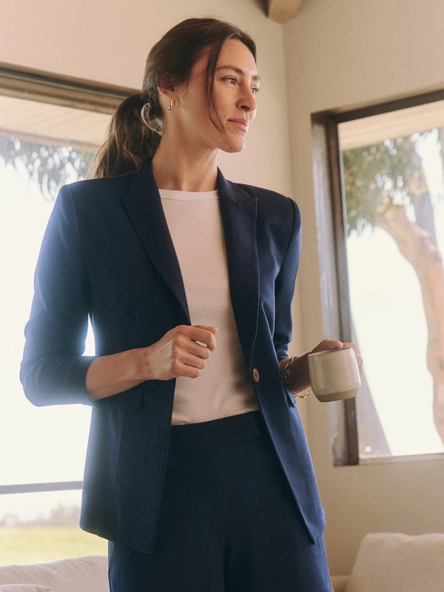 A classic blazer silhouette with the key detail of ruched sleeves that bring the sleeves to ¾ length. We recommend wearing it with a tank to show some arm during the warmer months. Match it with the Avenue pant for a suited look or make it your own: we’re wearing ours with denim. With a single button closure and functional pockets!