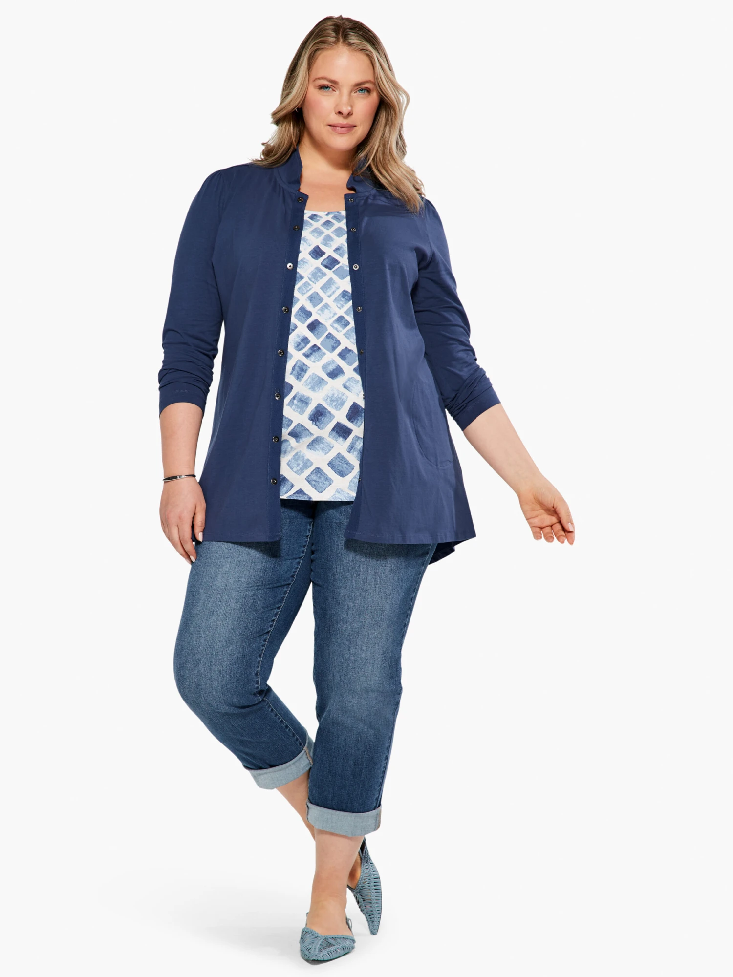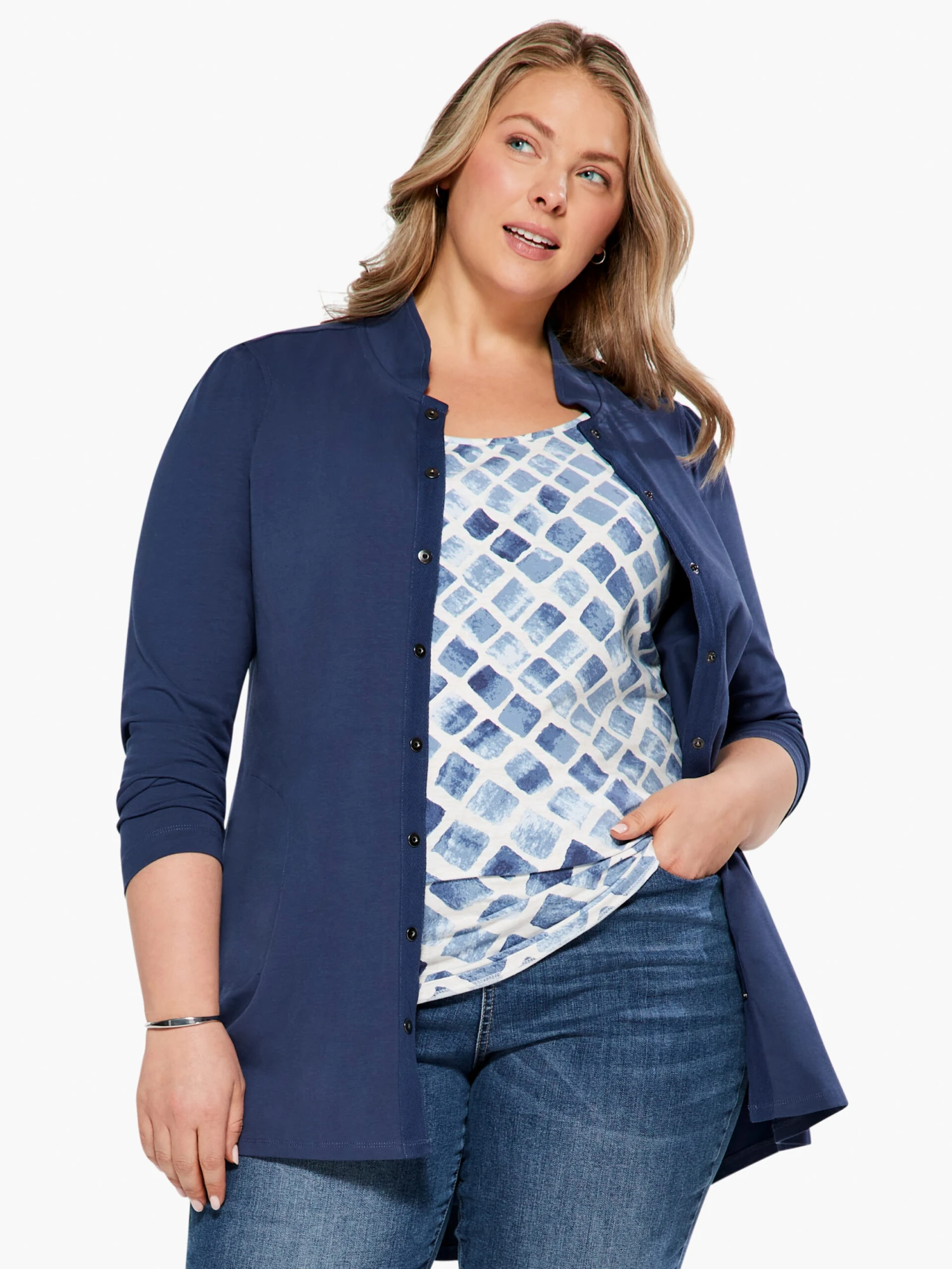 We don’t like to include “perfect” in the name of anything unless it happens to be exactly that. Made of 95% cotton with just a touch of added stretch, the comfort and flexibility of this jacket means it’s never far from our rotation. With a stand collar, secure snap closures, and functional pockets. The gathering detail at the top of the sleeve adds interest to the look.