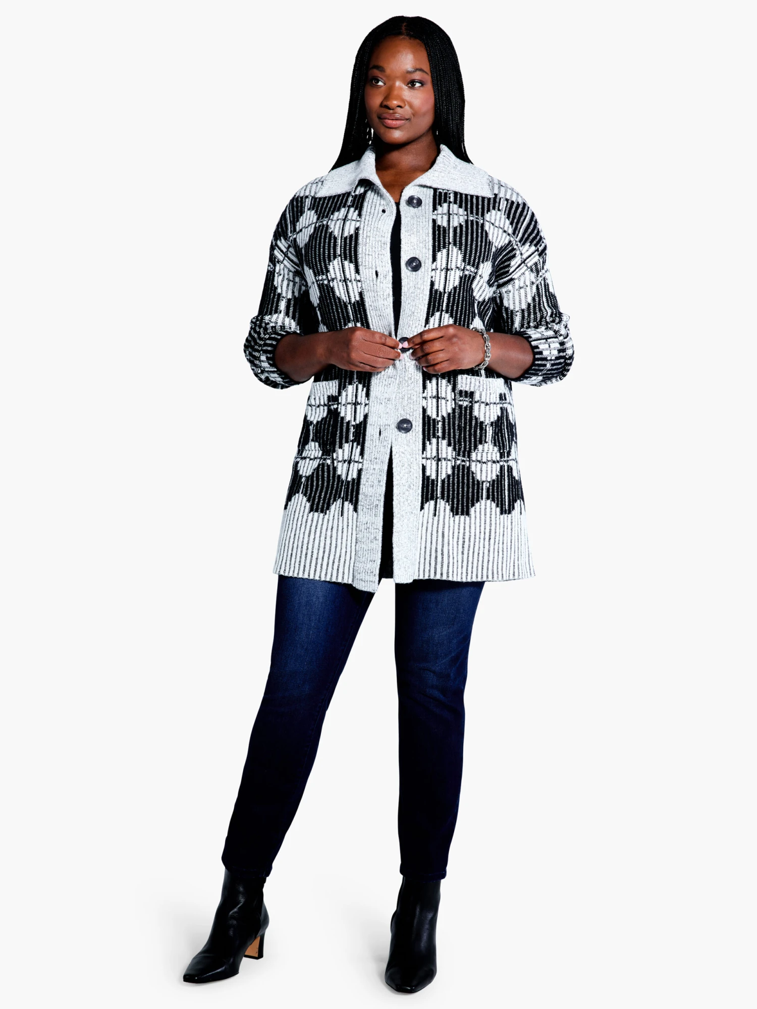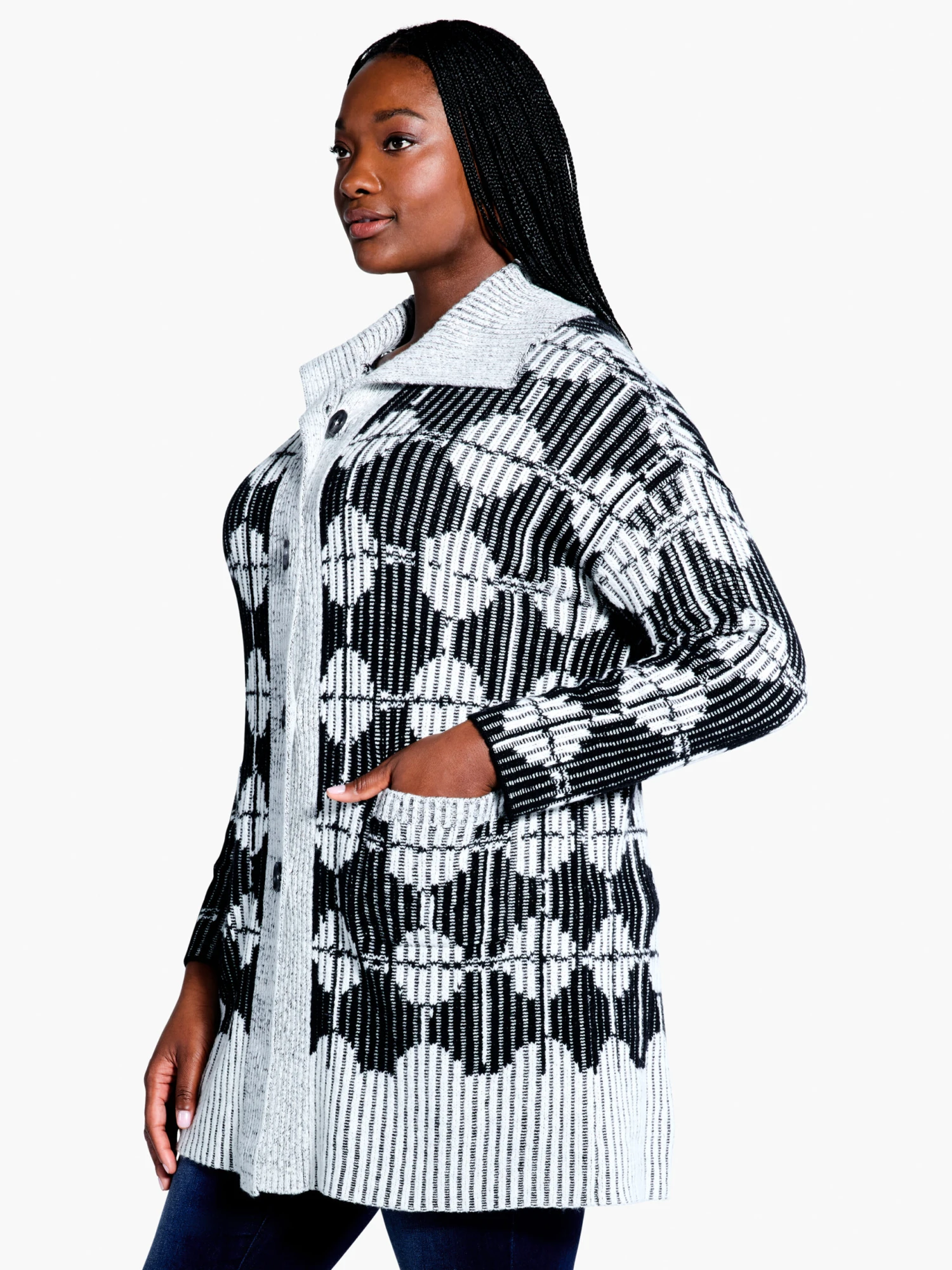 A dramatic, drapey piece that redefines what knitwear can be. Throw on this black and white stunner featuring a unique pattern to instantly elevate even the most casual of layered looks. Made from a luxe double knit jacquard stitch featuring roomy, dropped shoulder fit and a button front to give you more options on how to wear it. Tunic length and with a shawl collar for extra coziness.