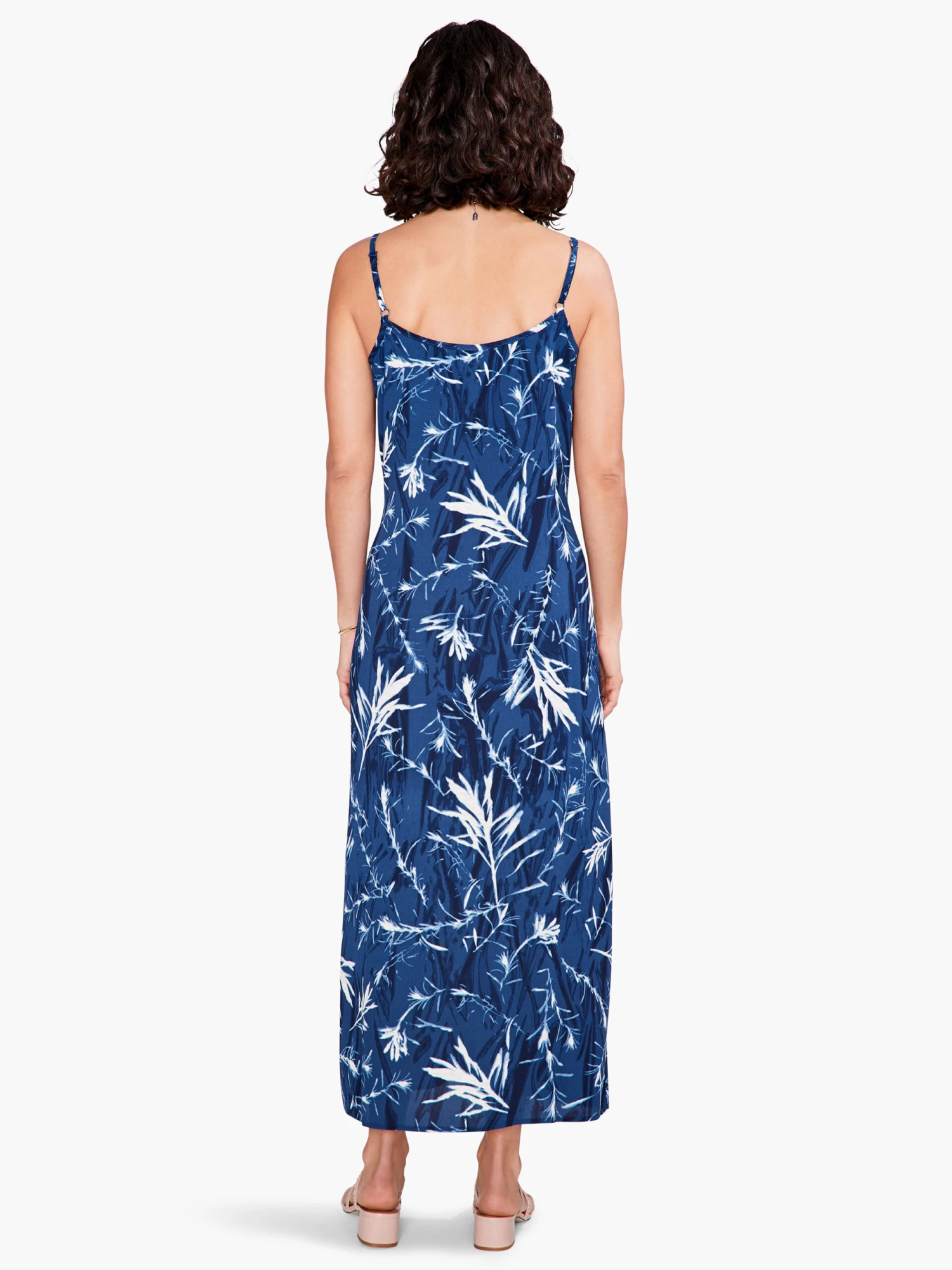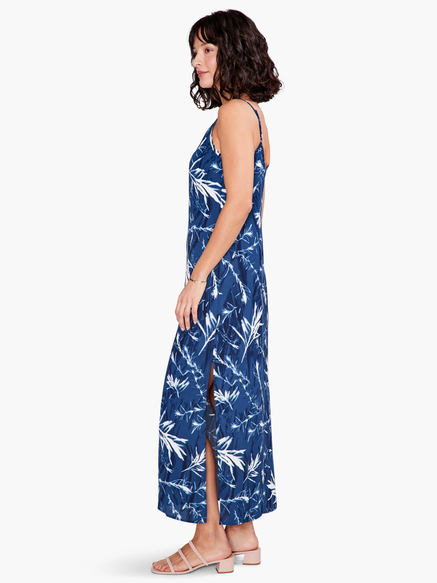 A vintage sheath silhouette with a modern blue and white print inspired by nature. A regular fitting sleeveless dress that’s not too loose or tight, making it perfect as an underlayer for a jacket, blazer, or cardigan. With a V-neck and a side slit detail that adds some extra character to your look.